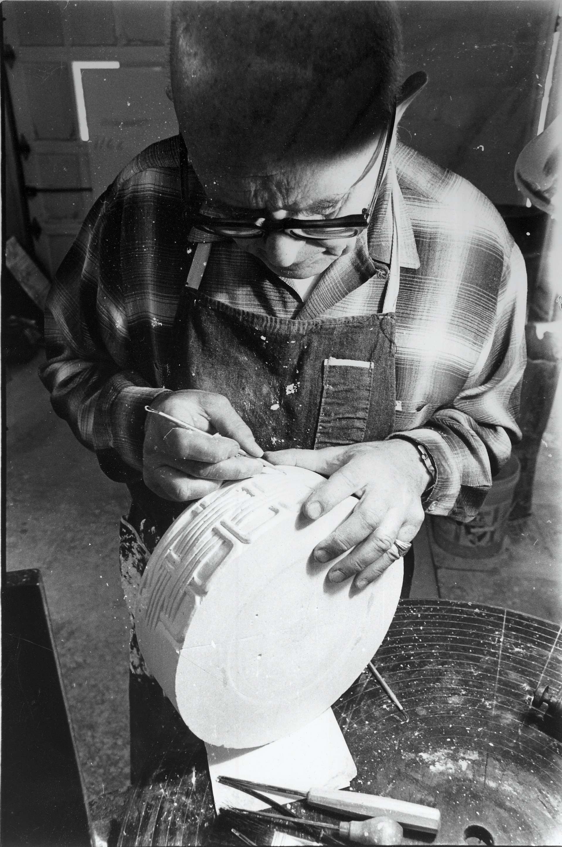 here he is sculpting the plaster model for the basketweave bowl...